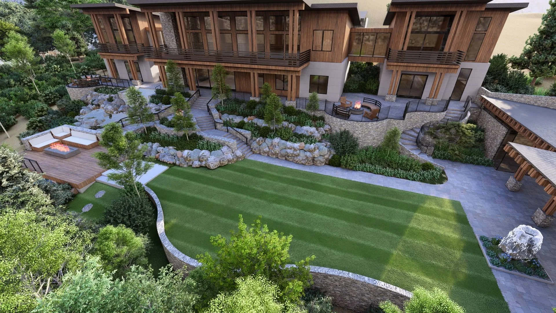 We layer color, movement, and structure to complement stonework, steel, and wood.