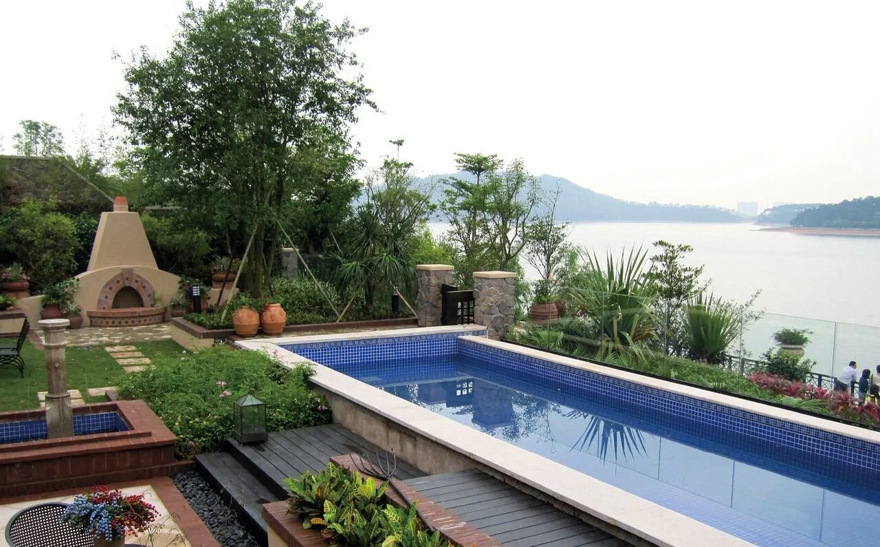 When tropical is your preference, choosing a freeform pool with palm tree accents and a blue-hued pool tile can bring the feeling of salty air to your backyard. Incorporating a waterfall in one section of the pool can mimic a tropical waterfall and give friends and family a place to feel as if they were in the jungle under a falling cascade of water.