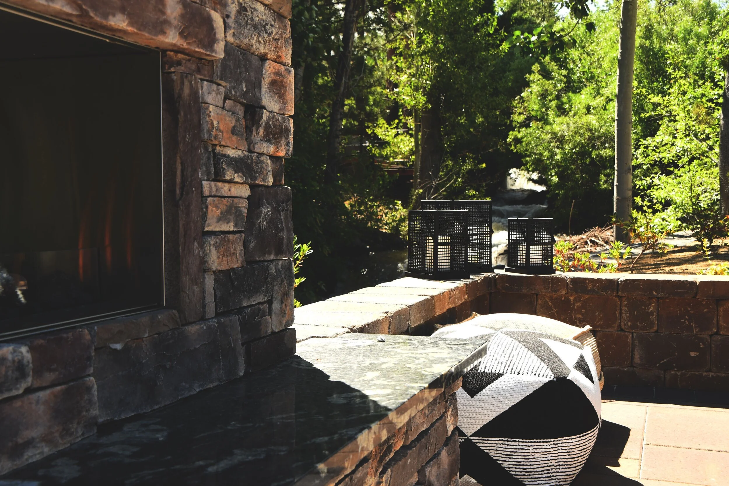 The main stone of the fireplace can also be the primary stone of the retaining wall. By choosing a contrasting stone as a border within the fireplace front to echo in the wall, the two spaces can feel connected even if they are far apart. Your landscaper can also add decorative tile to both features for more interest, while landscape lights that shine a soft glow onto the wall after dark can illuminate that space when the fireplace is in use. Having the ability to see both features after the sun sets can create a gorgeous display within the landscape.